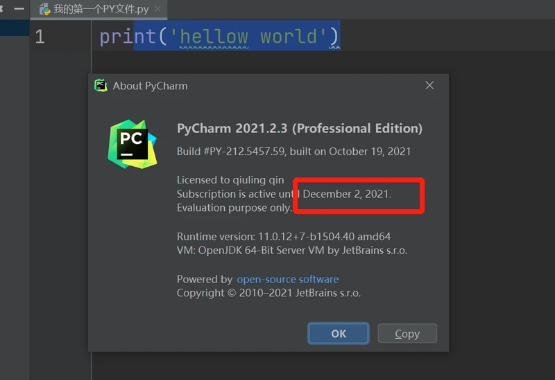 pycharm的过期时间可以在菜单Help-about里面查看。