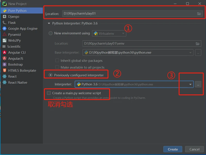 这里以试用为例,需要先按步骤用邮箱进行注册,完成后进到第一次设置页面,pure python -location选别的盘,不要C盘-选择第三个选项Previously configured interpreter -system interpreter-选择解释器-OK-回到pure-python的选项卡,最后一个main.py脚本文件可以选择勾选或者不勾选,初学者不建议勾选-OK即可。