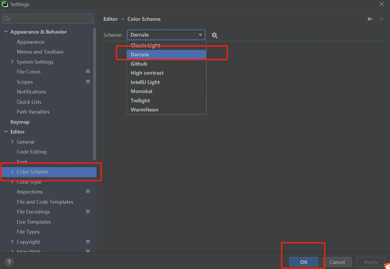 方式如下:菜单File-Settings-Editor-Color scheme-在scheme下拉选项连中可以一个个设置看一下,选择自己喜欢的,推荐暗色的,比较保护视力。