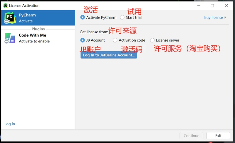 此软件一共有三种激活方式以及一种试用方式。这里我们略过第一种(JB账户即你需要账注册开发这个软件的公司账户,往里面充钱激活),下面会讲另外三种。
