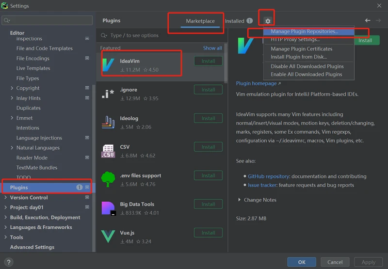菜单File-settings-Plugins-搜索IdeaVim-点击Manage Plugin Repositories-点+号-粘贴网址https://plugins.zhile.io -点OK;