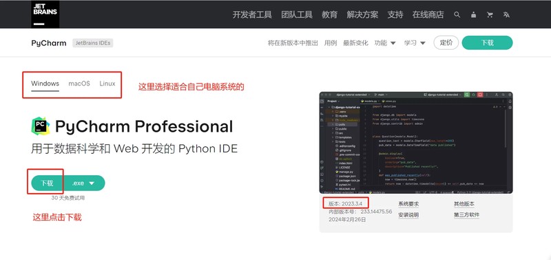 当前2024年,我们先从 Pycharm 官网下载 Pycharm 2023.4 版本的安装包,下载链接如下: