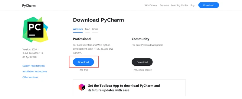 1. 官网下载pycharm安装包:https://www.jetbrains.com/pycharm/download/(特别注意:下载安装后,先不要打开)