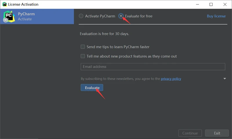4. 进入到主页面后,选择“Evaluate for free”免费试用,点击“Evaluate”