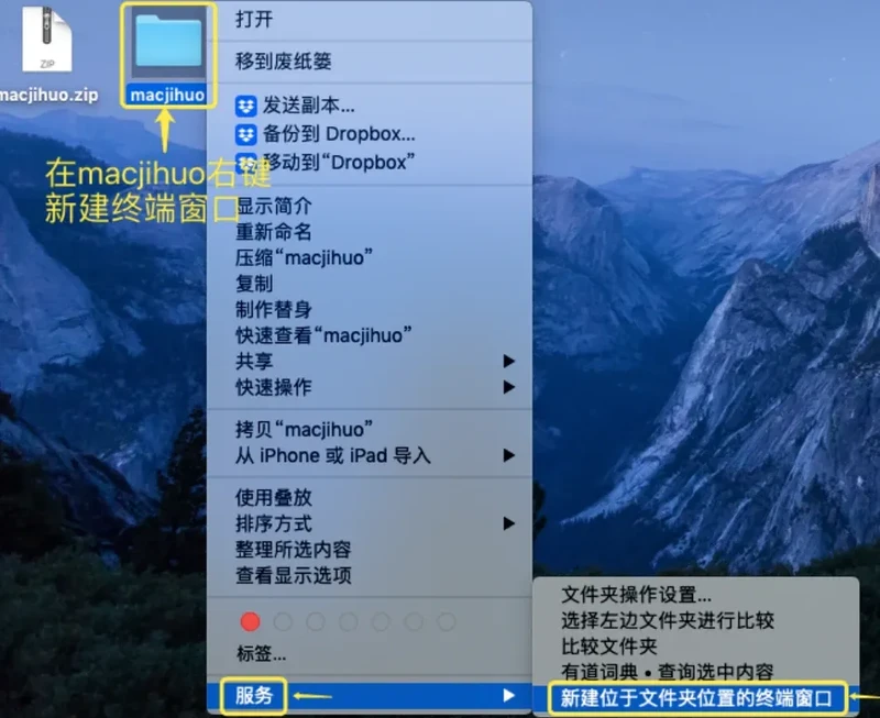第三步:选中macjihuo文件夹右键,新建桌面终端