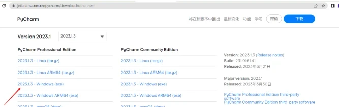 访问 Pycharm 官网,下载 Pycharm 2023.1 版本的安装包,下载链接如下 :