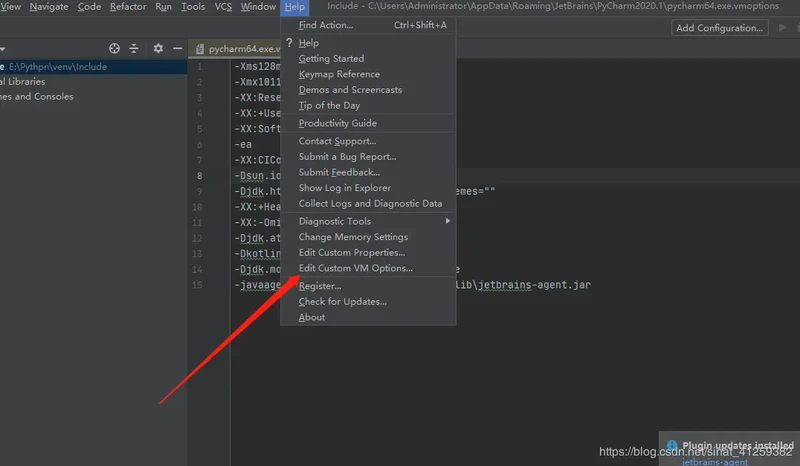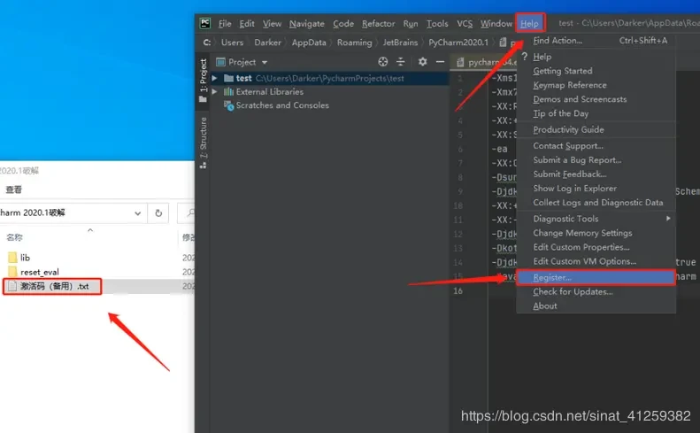 12、打开并复制“激活码(备用).txt”中的激活码,点击pycharm菜单栏中Help中的Register