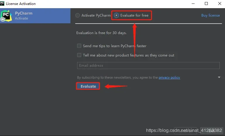 这里直接点击“Evaluate for free”先试用,然后点击“Evaluate”(如果提示已经过了试用期30天的,可以点击第2步中的第2个文件夹"reset_eval"中的“reset_jetbrains_eval_windows.vbs”进行重置使用状态)