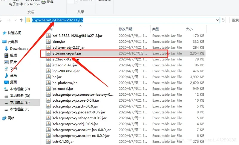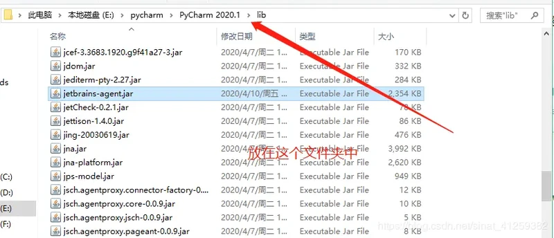 8、找到刚刚pycharm2020.1的安装路径下的lib文件夹下的“jetbrains-agent.jar”,复制好安装路径