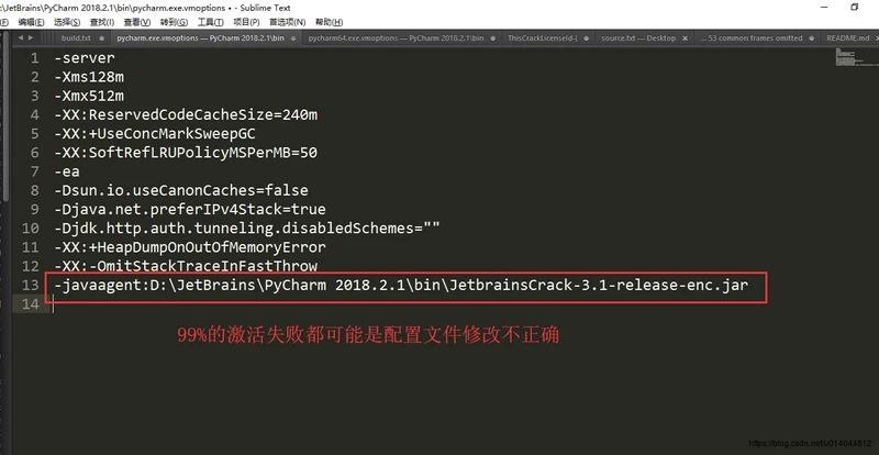 2.在 Pycharm安装目录的bin目录下找到 和 (如果你是idea激活则是:idea.exe.vmoptions和idea64.exe.vmoptions),以文本格式打开并同时在两个文件最后追加 -javaagent:E:PycharmPyCharm 2018.2.3binJetbrainsCrack-3.1-release-enc.jar,注意路径修改成你的pycharm安装路径,然后保存。(一定要注意把JetbrainsCrack-3.1-release-enc.jar的路径改成你的路径)