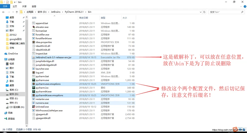 1.下载 https://pan.baidu.com/s/119UO4SGIEW_cxf0LmZzx3w 并将 JetbrainsCrack-3.1-release-enc.jar 放置到 pycharm安装目录的bin目录下(位置可随意,只要配置文件填写相对应的路径)。