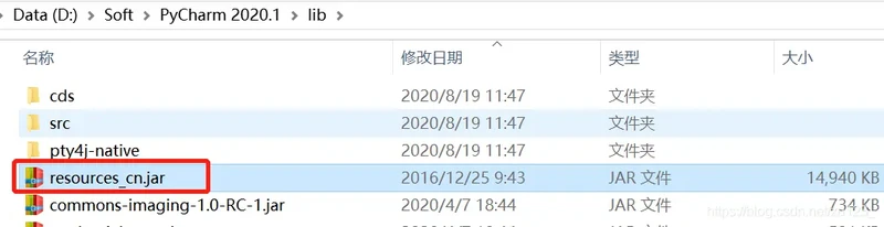 1、汉化包解压后,将resources_cn.jar,直接放入Pycharm安装目录的lib文件夹下即可。