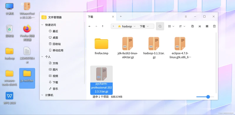 将下载好的文件拖入虚拟机中,将pycharm安装压缩包放入虚拟机中的 ~/下载 目录下,将补丁放到桌面: