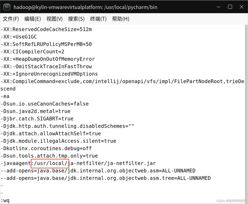 进入/usr/local/pycharm/bin目录下,修改配置文件pycharm64.vmoptions(2018版本及以下不需要在配置文件pycharm64.vmoptions中输入最后两行代码,当然所有的注释也没必要写入😊):