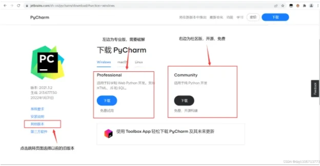 默认下载的是最新的版本,这里我们选择的是2021.3的版本,所以需要点击左下角’其他版本‘下载,跳转页面。