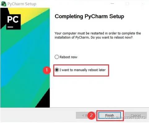 安装完毕后问是否重启电脑,选择下面的稍后重启,然后点击 Finish。
