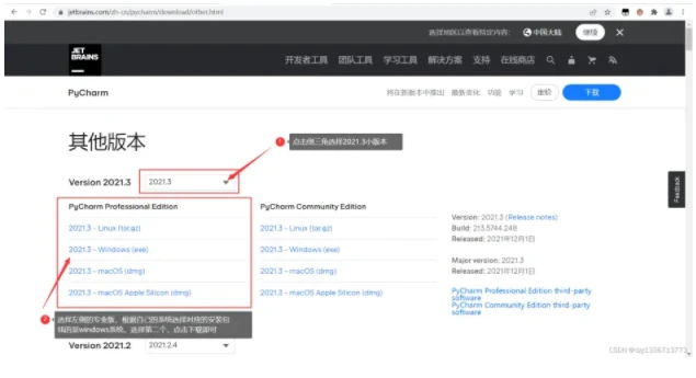 点击倒三角,选择2021.3版,根据自己的系统选择对应的安装包,单机下载,等待下载完毕。