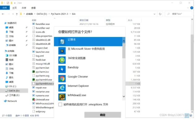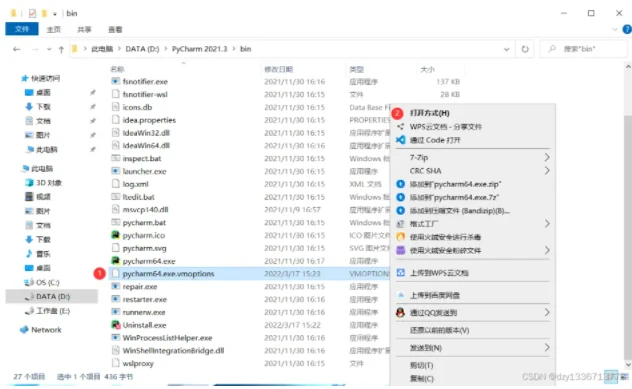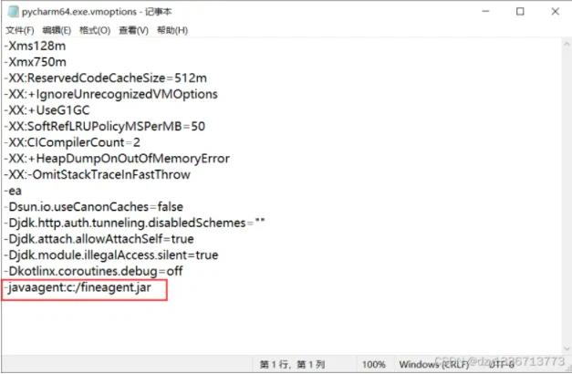 在pycharm 的安装路径,找到叫 pycharm64.exe.vmoptions 的文件,右键选择打开方式