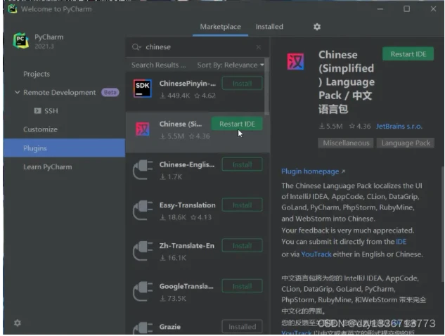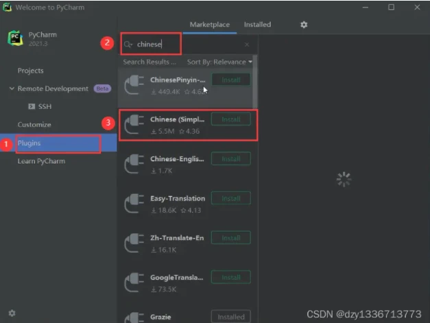 创建项目前,点击左侧的 Plugins ,在搜索框内搜索 chinese ,选择 Chinese(Simplified) Language Pack 中文语言包,点击 Install 下载。