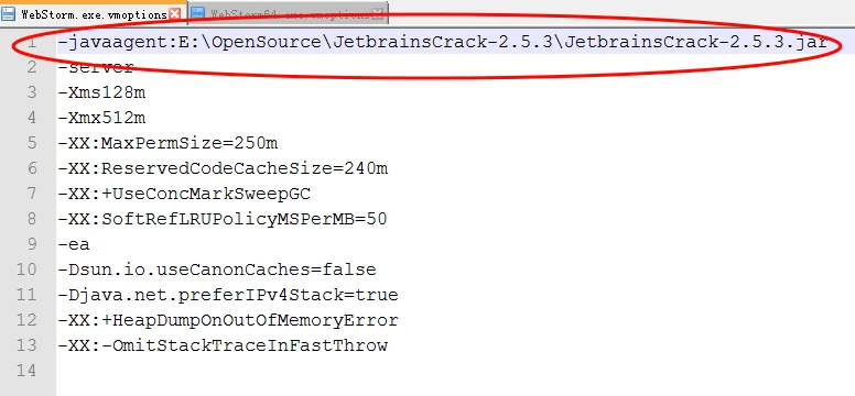 3.编辑WebStorm安装目录下 bin 文件夹中的 WebStorm.exe.vmoptions 与 WebStorm64.exe.vmoptions 文件, 头部加上 -javaagent:E:OpenSourceJetbrainsCrack-2.5.3JetbrainsCrack-2.5.3.jar