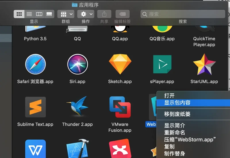 第二步:如果打开了WebStorm,先关闭。在应用程序中找到WebStorm,右键显示包内容,如图所示: