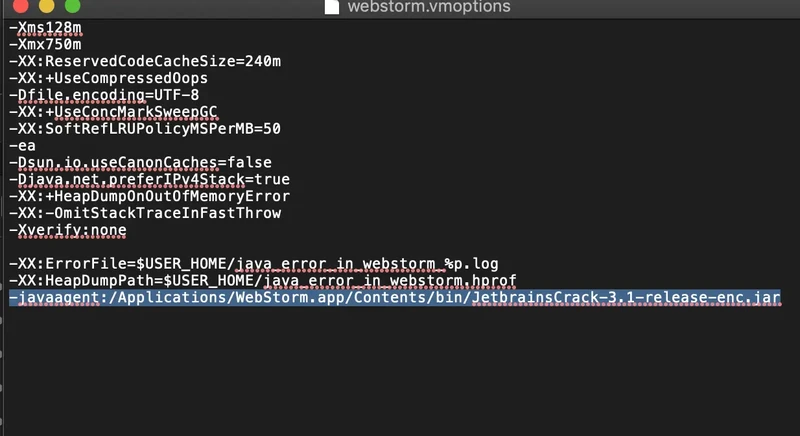 第三步:将 webstorm.vmoptions 文件以"文本编辑"打开,在末尾处配置补丁文件路径:添加后command + s 保存。