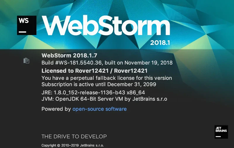 在电脑左上角点击 “About WebStorm”,可以看到激活到2099年,在我们有生之年足够用啦...