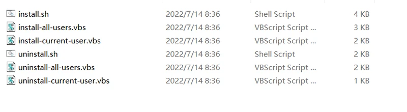 里面有六个脚本文件,vbs 结尾的是 Windows 系统下使用的脚本、sh 结尾的是 macOS 和 Linux 系统下使用的脚本。至于 install 和 uninstall 则是安装与取消安装,一般来说大家只使用 install。
