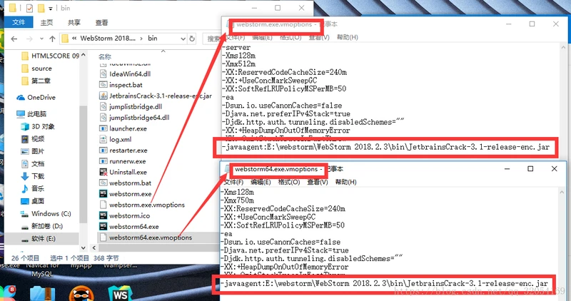 3.再用记事本打开“webstorm.exe.vmoptions”和“webstorm64.exee.vmoptions”这两个文件(这两个文件也在bin目录下),再后面添加激活成功教程文件的路径,就是中括号中的内容【-javaagent:E:webstormWebStorm 2018.2.3binJetbrainsCrack-3.1-release-enc.jar】