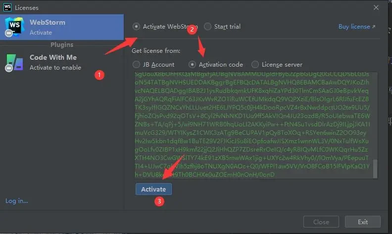 2、 这个项目就是让你选择激活方式的,这里选择Activate WebStorm -> Activation code ; 我们要先获取WebStorm激活码(vrg123.com)粘贴进Activation code下方的框里;
